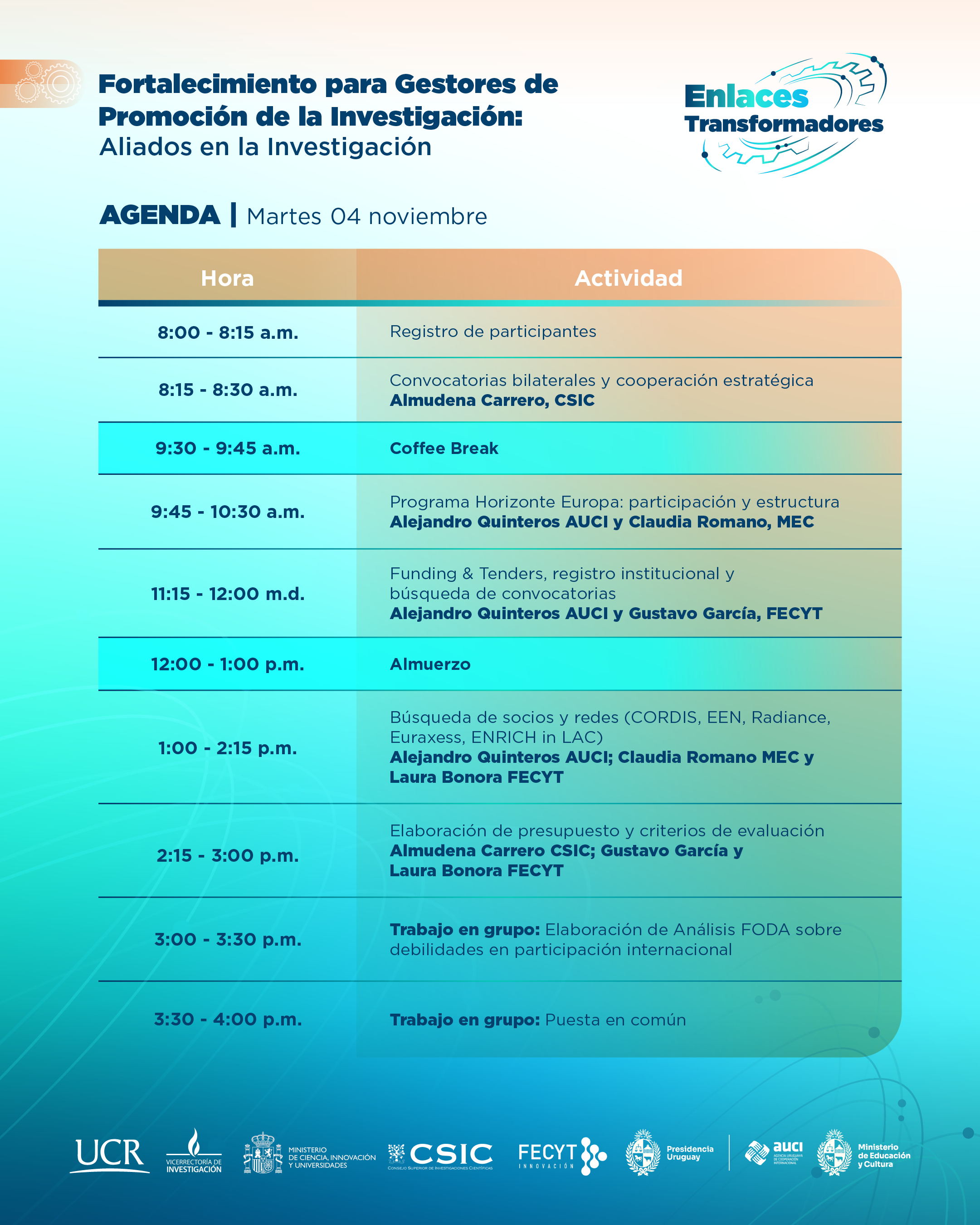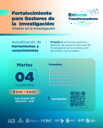 Objetivo: Proporcionar herramientas y conocimientos actualizados a las personas que brindan apoyo directo a las personas investigadoras en la formulación de proyectos y otros procesos clave (asesoría legal, vinculación internacional, etc.).